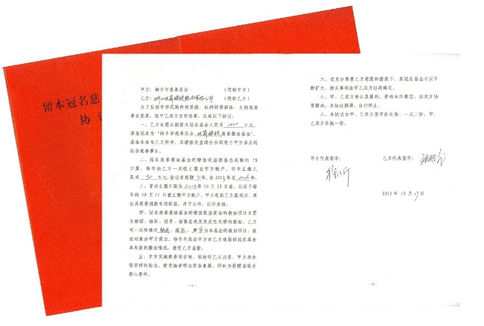 当天会场还举行了企业留本冠名基金签约仪式 。我公司鼎力大举支持慈善事业 ,自愿认捐留本冠名基金1000万元 ,其增值收益资金所有用于桐乡市慈善事业 ,助困、助医、助学、助孤老残及突发性灾难救助 。“行有道 ,爱无界” ,中欧体育愿与市慈善总会一同起劲 ,在扶贫助困、增进协调社会建设中作出更大孝顺 。