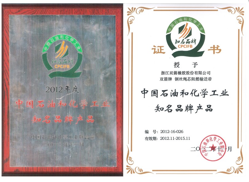 中欧体育牌运送带被评为2012年度中国石油和化工行业着名品牌产品